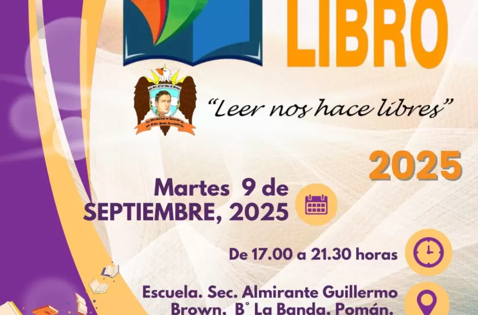 Mañana martes de 17:00 a 21:30 horas, la Escuela Secundaria Almirante Guillermo Brown del barrio La Banda, en Pomán, será el escenario de la 1° Feria del Libro, un acontecimiento cultural y educativo que marcará un hito en la vida institucional y comunitaria. La actividad se realiza en el marco de los festejos por los 392 aniversario de la ciudad Pomán.