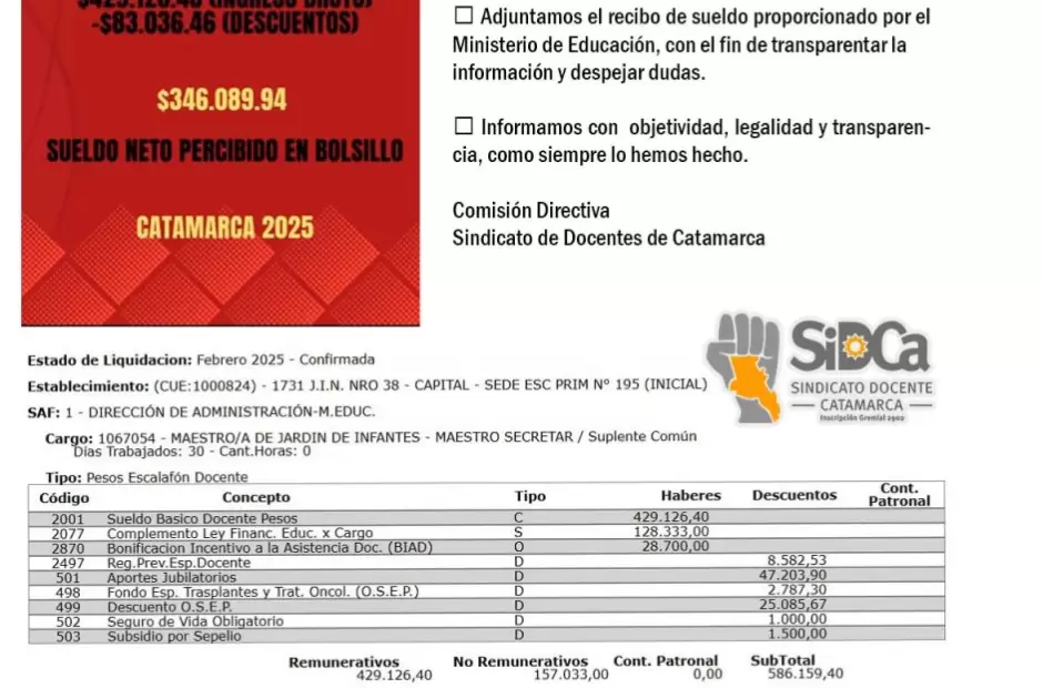 "Con el objetivo de que nuestras afiliadas y afiliados cuenten con información clara y veraz, y ante la circulación de publicaciones erróneas en redes sociales, queremos precisar cuál es la realidad que reflejan los recibos de sueldo, conforme a los datos proporcionados por el Ministerio de Educación. Todo lo aquí expresado se encuentra respaldado por la normativa legal vigente, en particular por el decreto que compartimos en esta comunicación. Según dicha normativa, ningún docente que recién se inicia puede percibir menos de $500.000, y en el mes de mayo, ese monto se actualiza a $550.000", declaró el gremio.