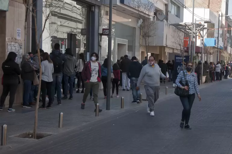 Las sucursales del Banco Nación tienen desde hace tres días largas filas por el doble trámite de los que deben retirar las tarjetas para el cobro del IFE, que estaba acreditado para algunas terminaciones de DNI, y que tras conseguir el plástico deben volver a esperar para extraer el dinero del cajero automático.