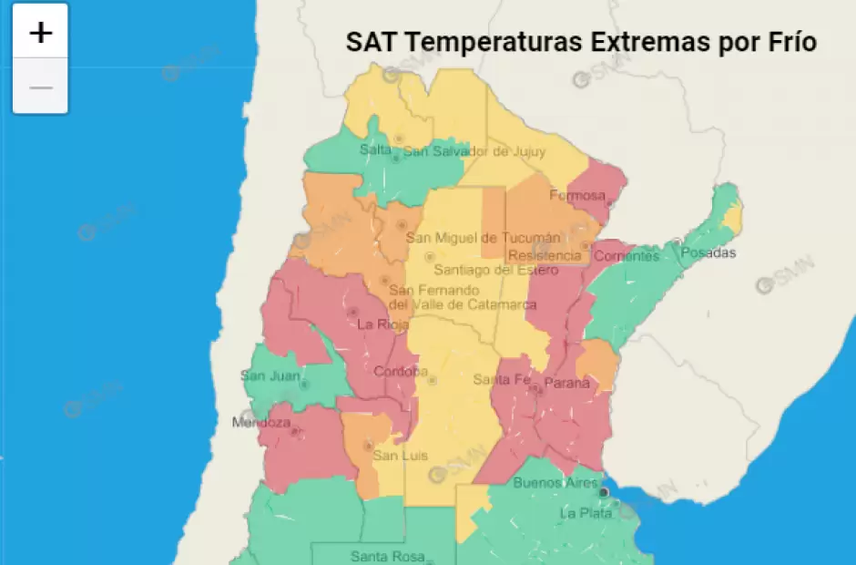 Por último, el SMN pintó de amarillo la mayor parte de Córdoba, Jujuy, Salta, Formosa, Chaco, Santa Fe, San Luis, y algunas localidades de Misiones. Sí, la corriente fría se apoderó de la región centro norte de Argentina.