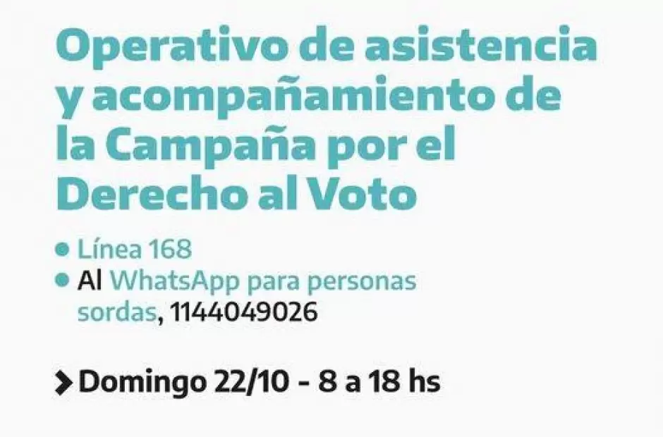 Durante la jornada electoral, desde las 08 y hasta las 18 horas, agentes del INADI recibirán consultas y denuncias de todo el país a través de la Línea 168 y del servicio de videollamadas en Lengua de Señas Argentina (LSA) para personas sordas e hipoacúsicas a través de un video vía WhatsApp al 1144049026, para abordar situaciones discriminatorias y/o que dificulten el derecho al voto de todas las personas. Habrá articulación a nivel federal a través de las delegaciones del INADI en las provincias.