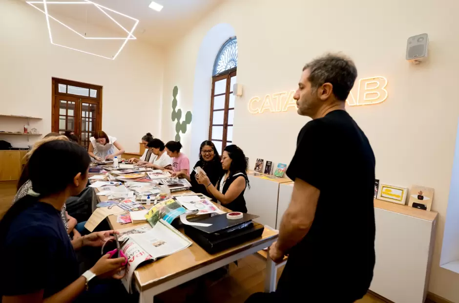 Luego fue el turno del taller de collage "Vivan las palabras", a cargo de Dimas Melfi, dirigido a jóvenes y adultos. A través del arte y la experimentación con materiales, Melfi propuso reflexionar sobre el poder del lenguaje y su transformación. Durante el encuentro compartió parte de sus obras realizadas con técnicas de scratch y bordado, e invitó a los presentes a resignificar las palabras más allá del simple acto de recortarlas. "El lenguaje es orgánico y se va nutriendo", expresó el artista.