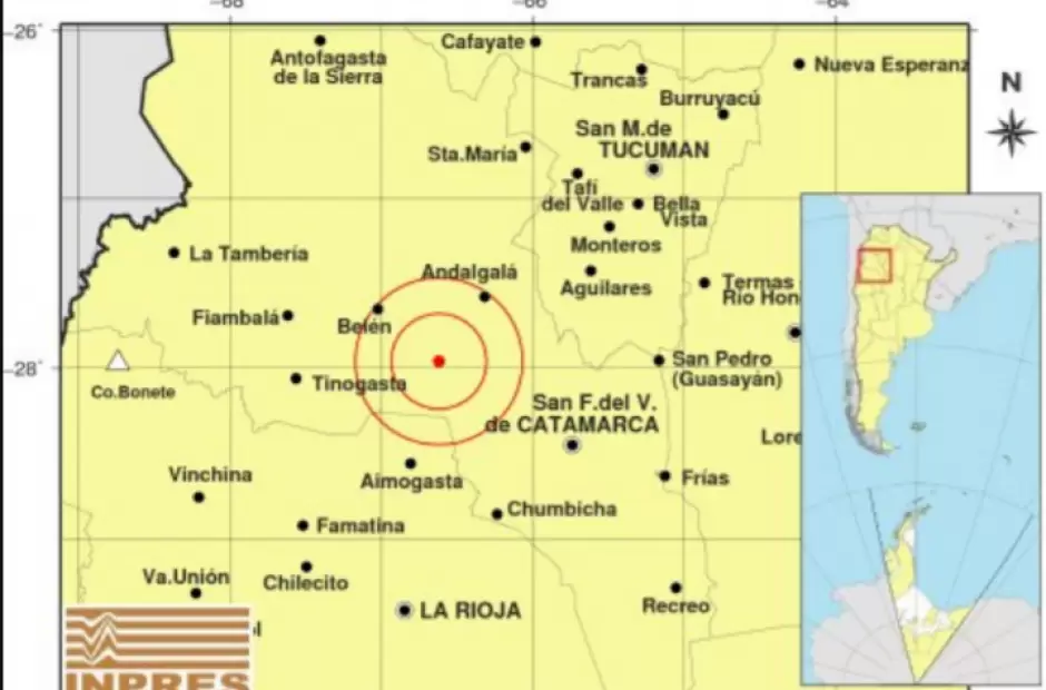 Aproximadamente a las 02:24 de la madrugada de este domingo, el Instituto Nacional de Prevención Sísmica registró un movimiento telúrico de magnitud de 3.5, con una profundidad de 200 km, cuyo epicentro fue a 102 km al Noroeste de San Fernando Del Valle De Catamarca, 162 km al Norte de La Rioja; 52 km al Suroeste de Andalgalá.