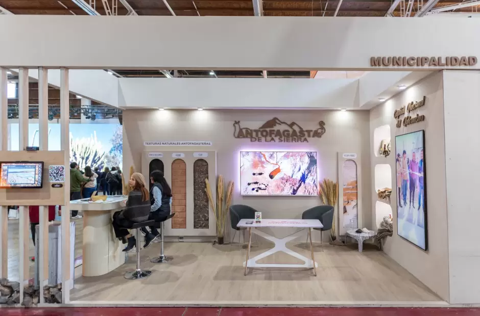 En el stand se puede visualizar las texturas locales de cenizas volcánicas, adobe y lajas; también el contenido audiovisual y folletería, código QR con el listado de hospedajes servicio gastronómico y guías; además de degustaciones de empanadas de quinoa, salame de llama, empanadas de llama y sorteos de estadía en la Hostería Municipal.