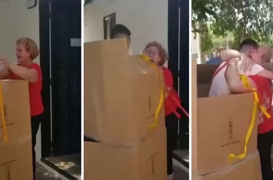 Un cordobés que se fue a vivir a Europa hace tres años volvió en una caja para darle una sorpresa a su madre y la reacción de ella al momento del reencuentro se hizo viral en las redes sociales.