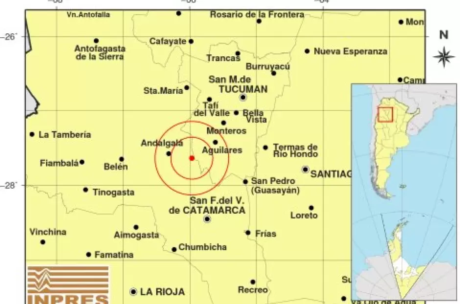 El epicentro ocurrió a unos 93 kilómetros al norte de la Capital, a 34 kilómetros al este de Andalgalá, y tuvo una profundidad de 10 kilómetros.
