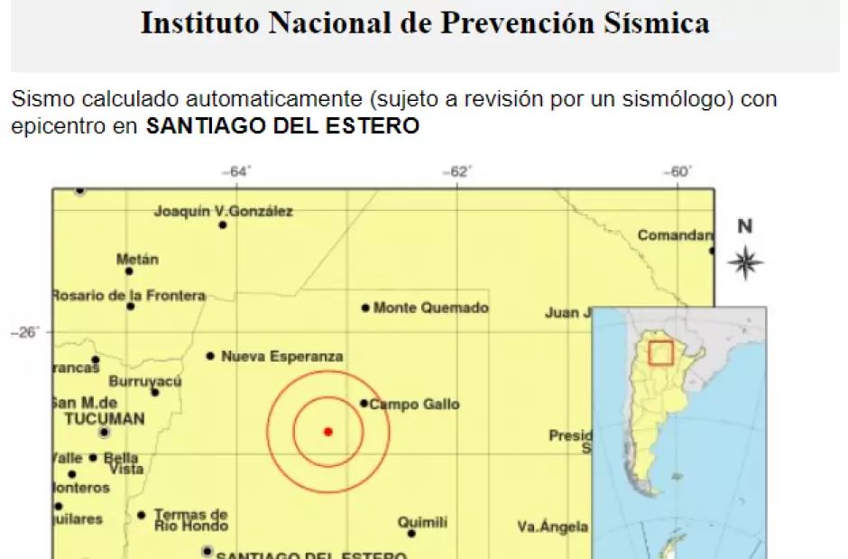 El temblor se registró alrededor de las 19:09 horas, según INPRES, y el epicentro fue a 152 km al Noreste de Santiago Del Estero; 202 km al Este de San Miguel De Tucumán; y a 42 km al Suroeste de Campo Gallo, a una profundidad de 593 km.