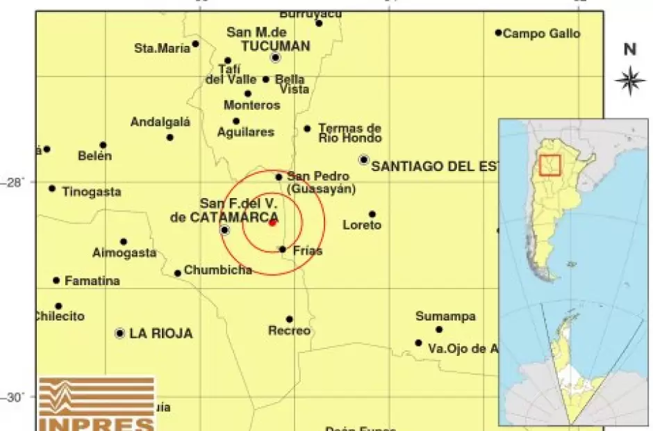 El temblor tuvo una magnitud de 2.5 grados en la escala de Richter y su epicentro se dio a 50 kilómetros al este de San Fernando del Valle de Catamarca, a 116 kilómetros al sudoeste de Santiago Del Estero y 30 kilómetros al norte de Frías.