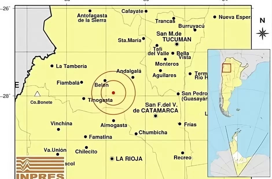 El epicentro fue a 120 km al Noroeste de San Fernando del Valle de Catamarca, 164 km al Norte de la Provincia de La Rioja y 37 km al Sureste de Belén.