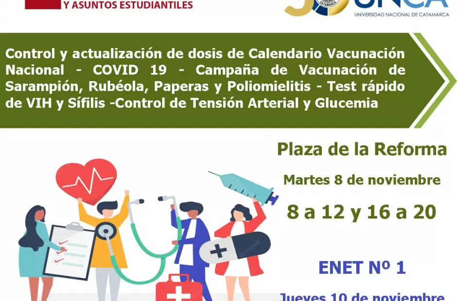 Desde el Vacunatorio del Centro de Salud Universitario de la Secretaría de Bienestar Universitaria y Asuntos Estudiantiles de la UNCA, la comunidad universitaria está invitada a acudir al control y actualización de dosis de calendario de Vacunación Nacional, COVID 19, campaña de vacunación de sarampión, rubéola, paperas y poliomielitis, Test rápido de VIH y sífilis, control de tensión arterial y glucemia.