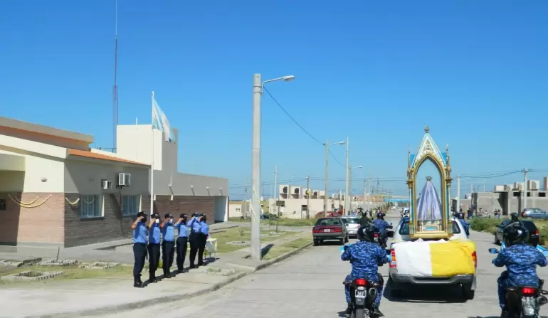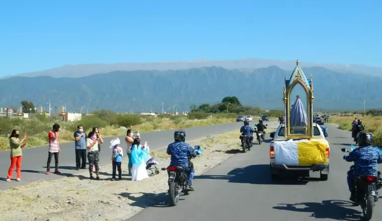 A las 11.00, partió desde su Santuario en la urna que la resguarda, llevada por el Obispo Diocesano, Mons. Luis Urbanc, en un móvil escoltado por agentes de la Policía de la Provincia motorizados y de la Guardia Urbana de la Municipalidad.